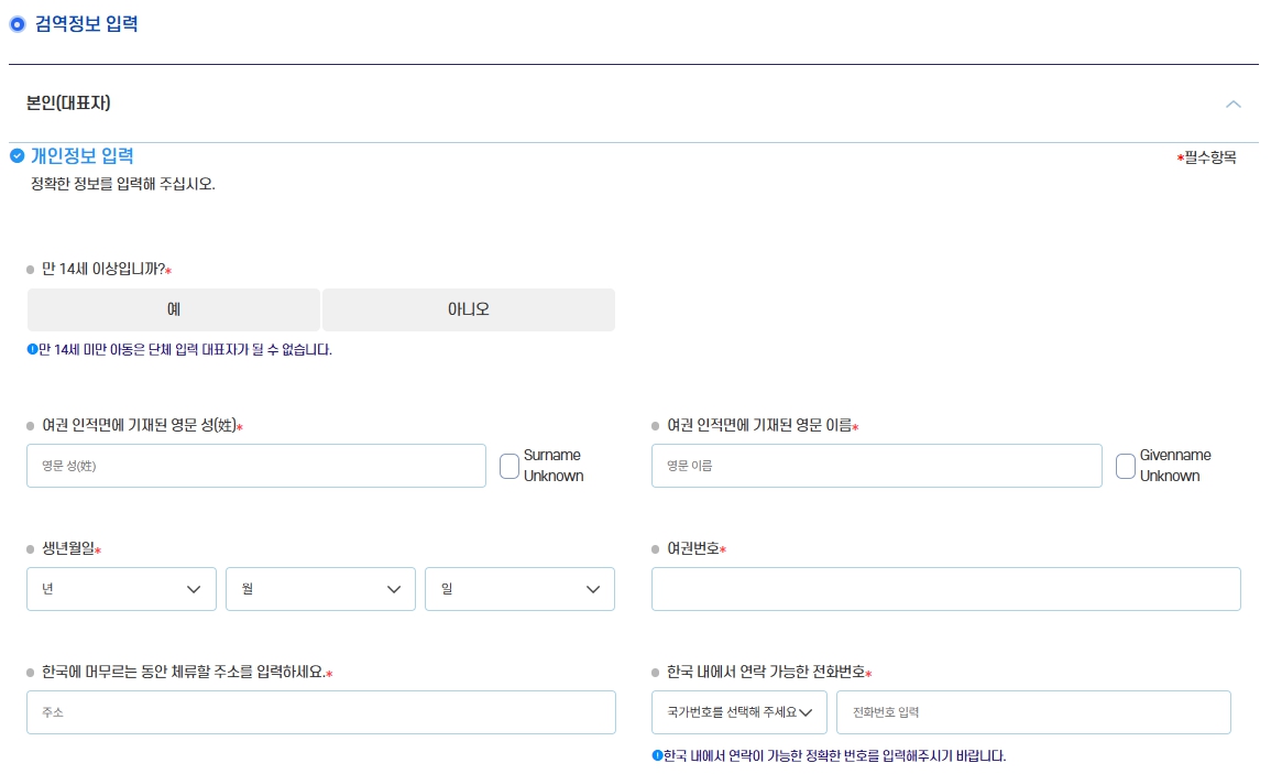 - 여권정보, 생년월일, 한국 체류 주소, 연락처 기재
